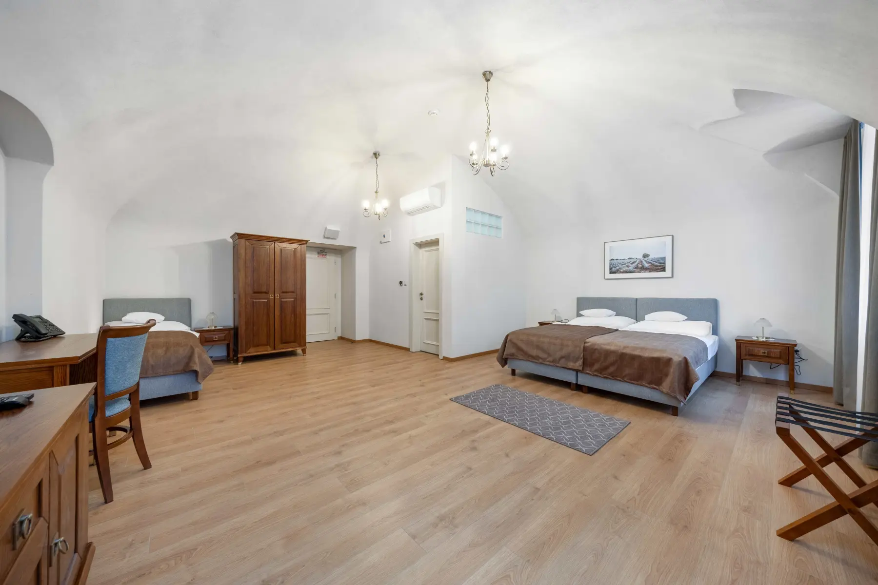 Rodinná izba s manželskou posteľou (v niektorých izbách oddeliteľnou) a jednou jednolôžkovou posteľou.